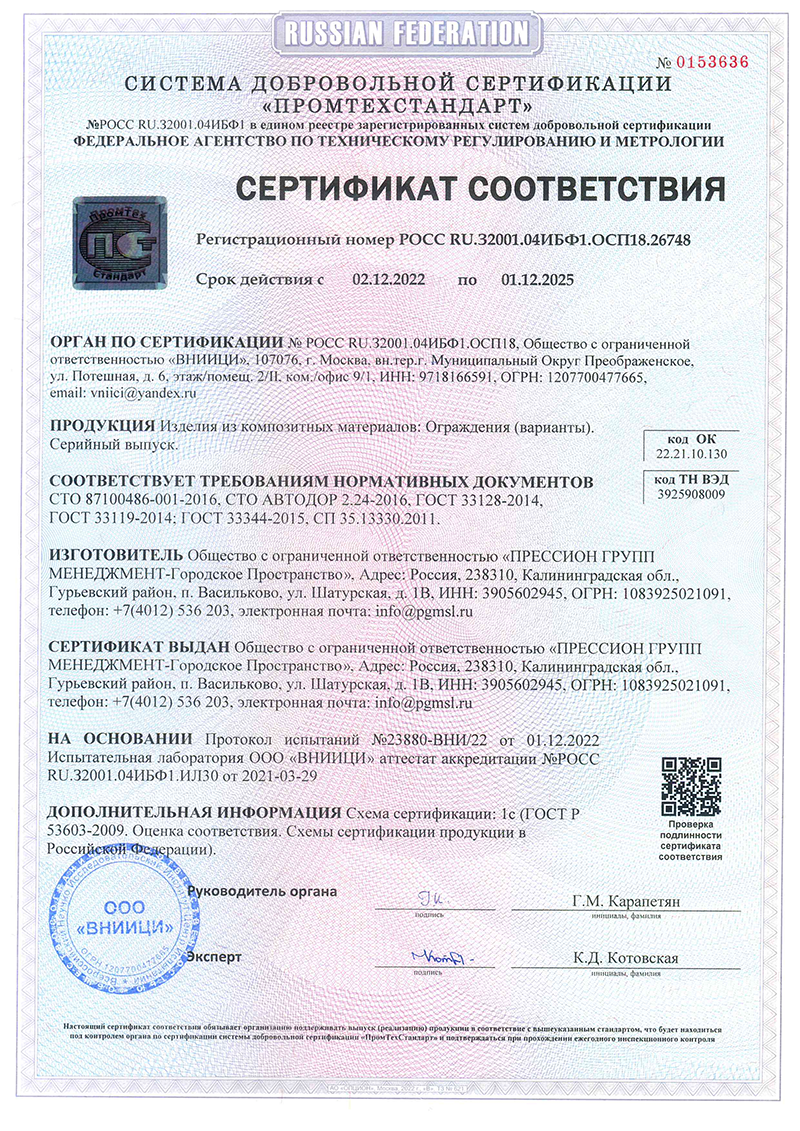 The full composite construction of the pedestrian railing is a prefabricated structure made of composite profiles and attachment nodes, which can include complex-shaped composite decorative and load-bearing elements. It is used as a pedestrian barrier to regulate pedestrian traffic.